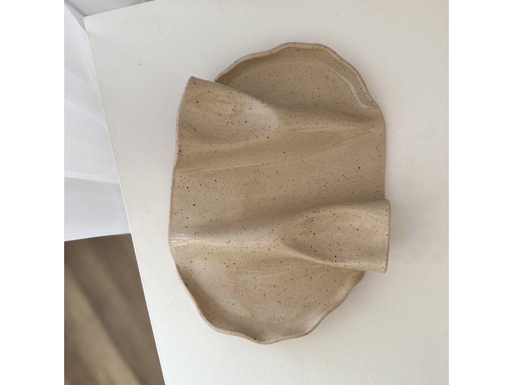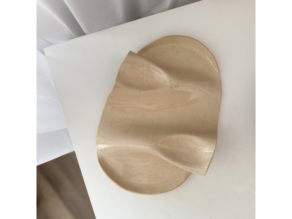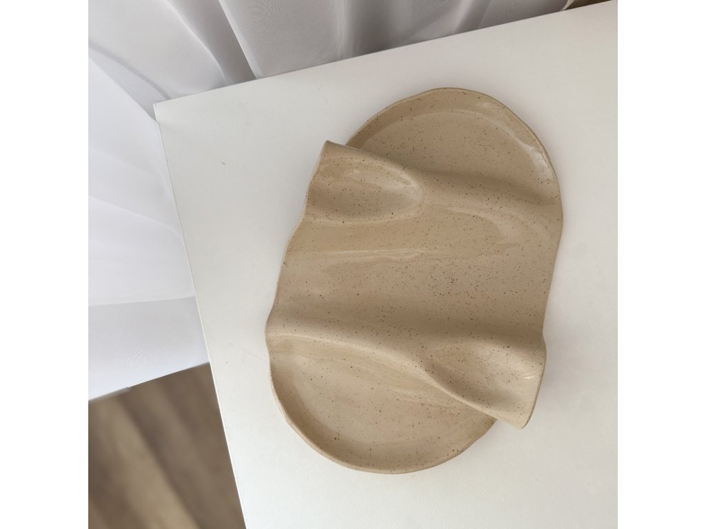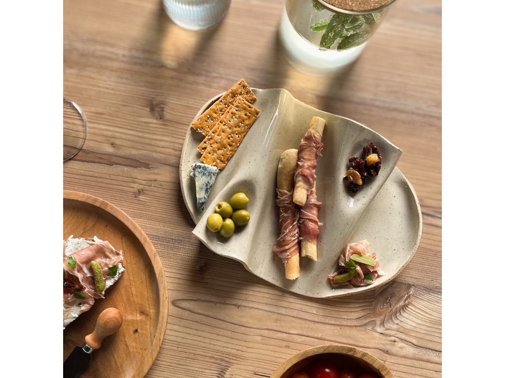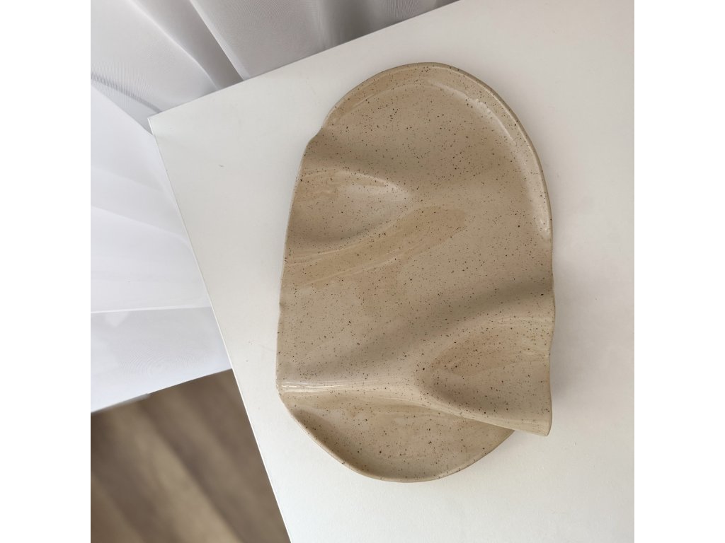 Tento servírovací tác je ručně modelovaný z kameniny a glazovaný jemnou kropenatou glazurou. I když mají všechny kusy podobnou velikost a tvar, díky ruční práci je každý kousek jedinečný ve svých detailech.