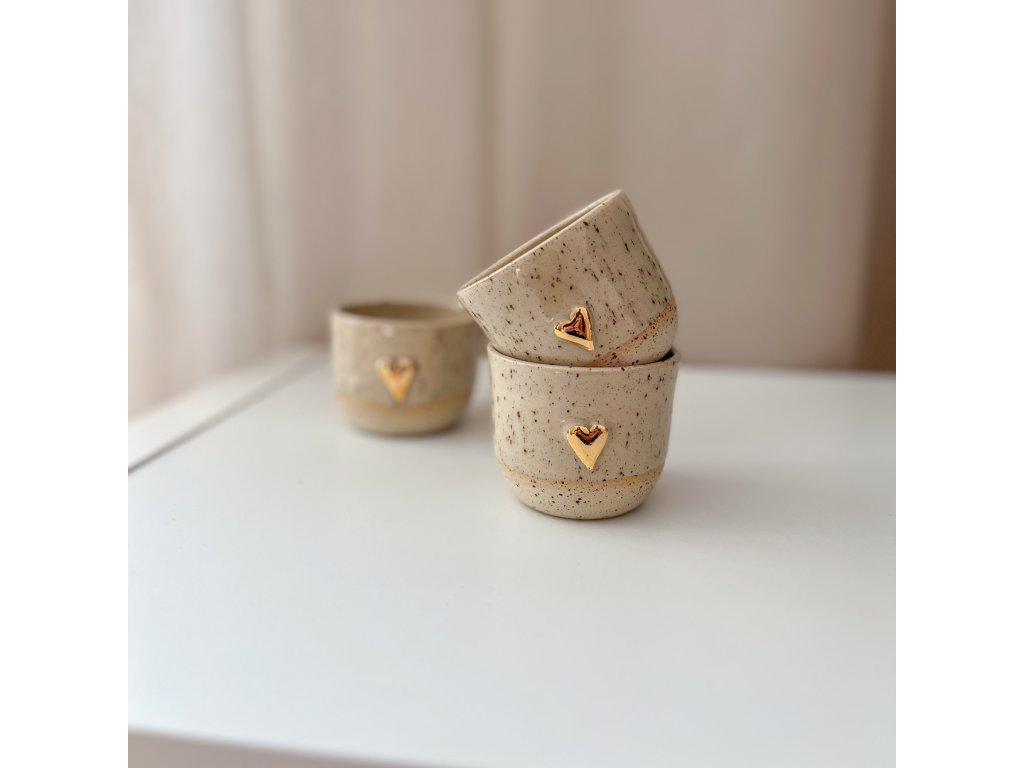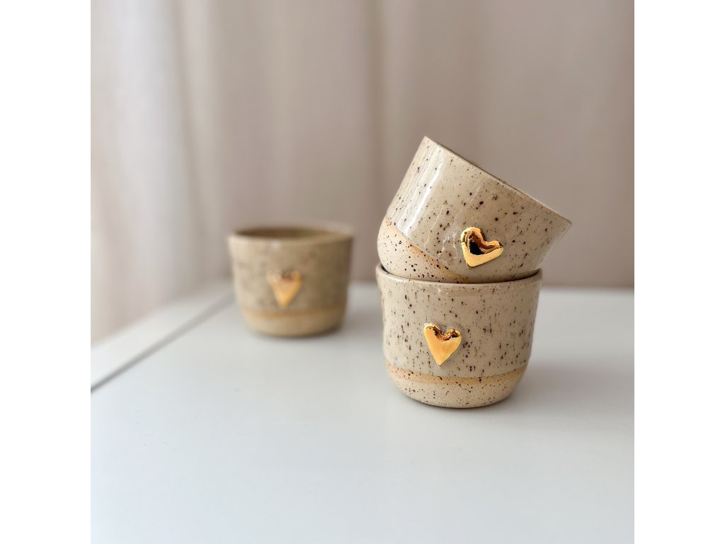 Tento hrníček je vytočen z pigmentové hlíny nebo bílé kameniny a je potlačen pravým zlatem.